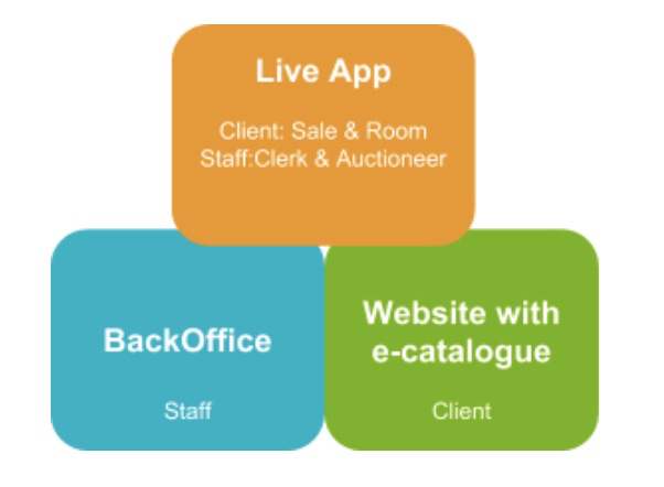 There are three components to the platform that are fully integrated, meaning that information flows freely between them. Bidding activity in the website and live app is reflected in the back office and the relevant information added in the back office, like the catalogue, on-behalf bids, or client bid maximums, is reflected in the website and live app.