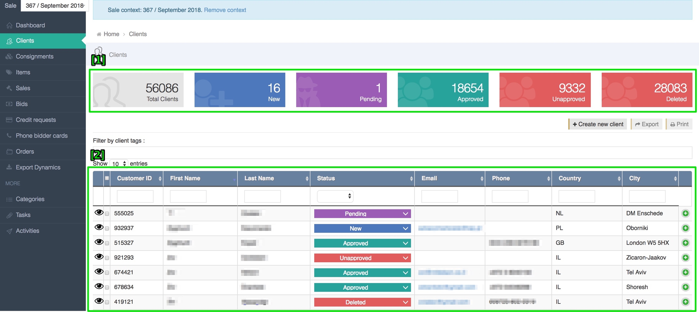 New - a new client that registered on the system or was created by admin. Pending - a client that is waiting to approved for bidding or selling. Approved - an approved client that can sell items or place bids in an auction. Unapproved - a client that was not approved to participate in the auction. Deleted - a client that has been previously deleted.