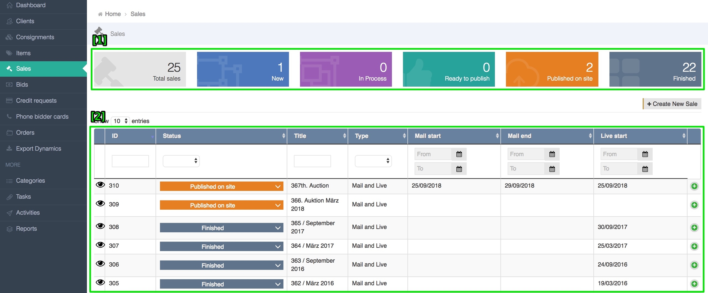 A sale is a group of lots (items) you will auction in one event. A sale can be 10 lots or 10,000 lots sold over 5 days.
