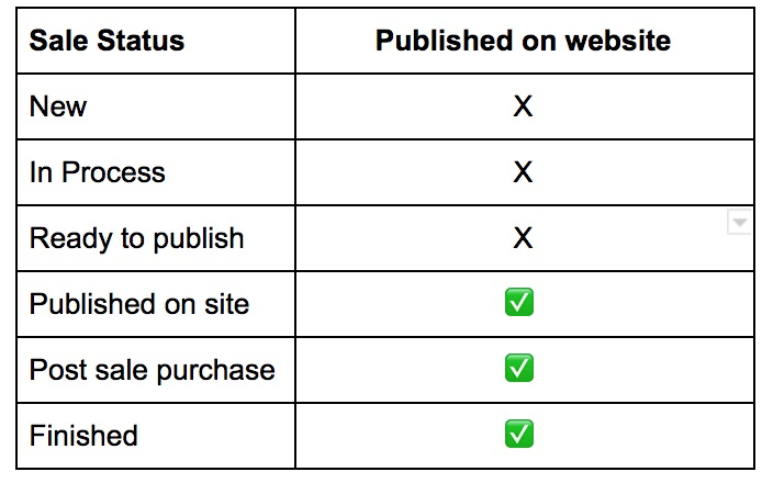 Note: if you want to make a change to a published sale, you need first to change the status to In Process and after done changing, set the status to Ready to publish so the changes will be synced to the website.