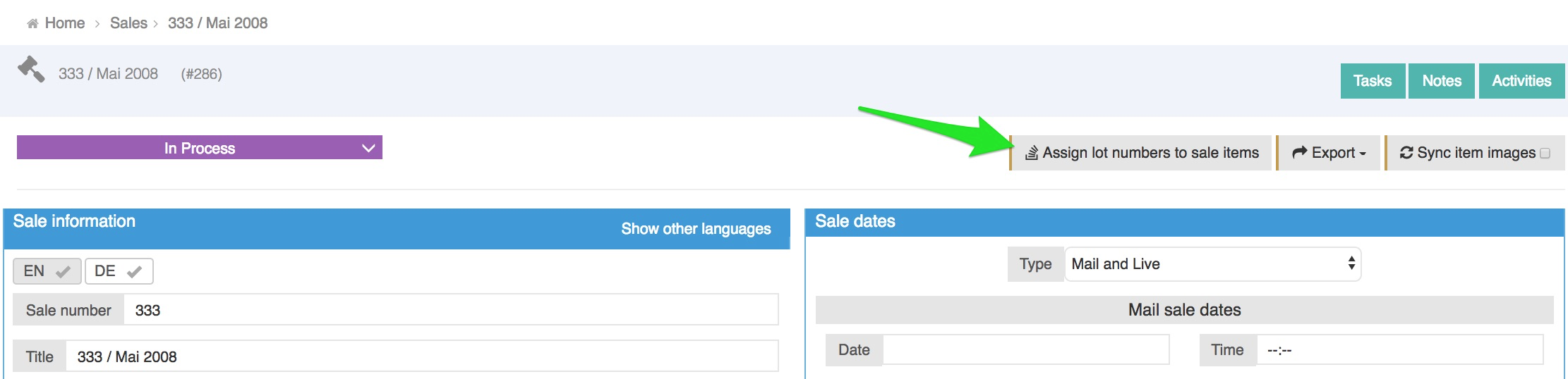 Assign lot numbers to sale items(note that this action is not available when the Sale status is set toNew).