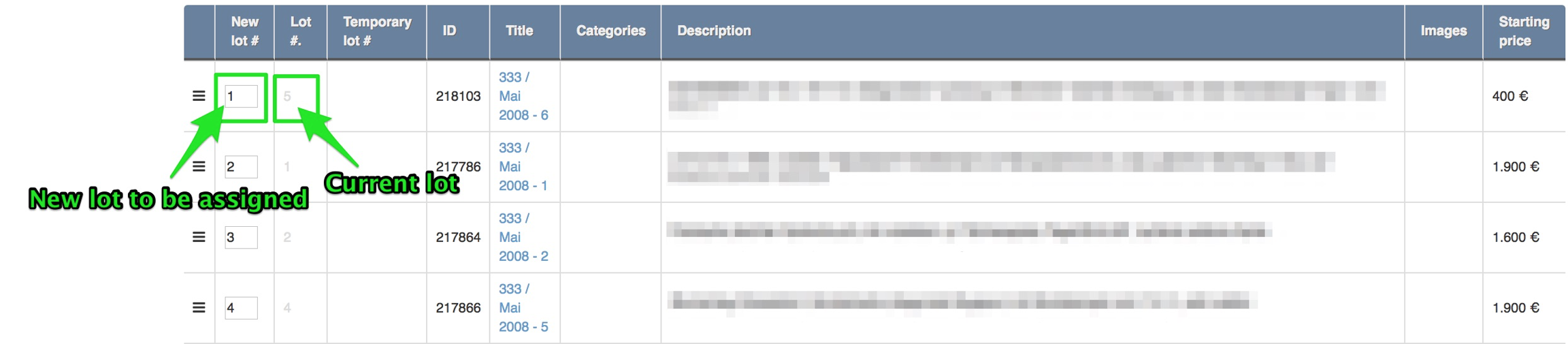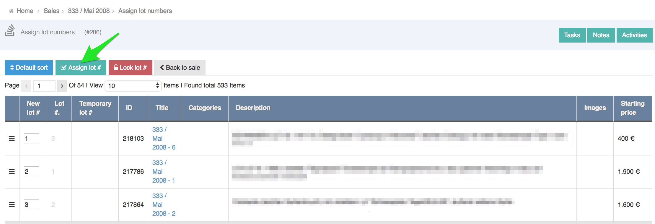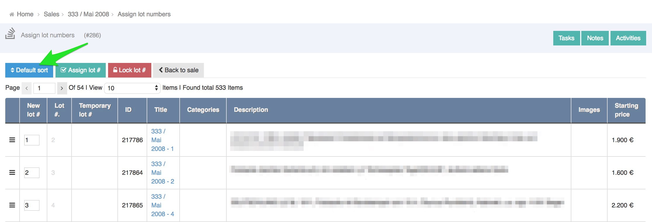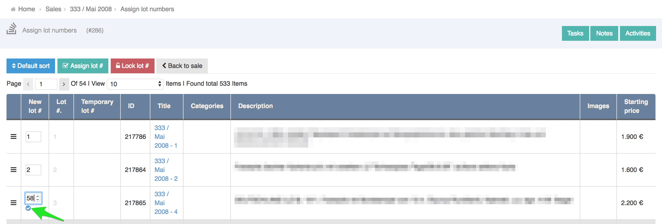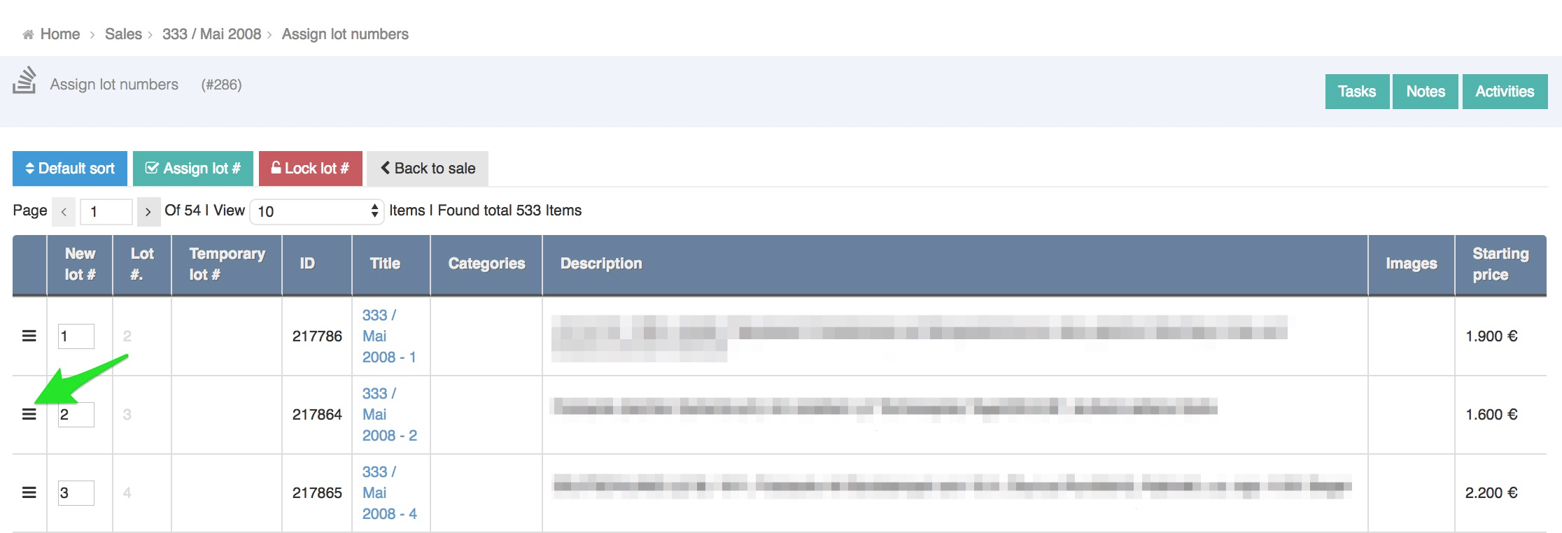 On the Lot numbering page you will see all the items in the sale. You can order the lot numbers in few ways that can be used in combination.