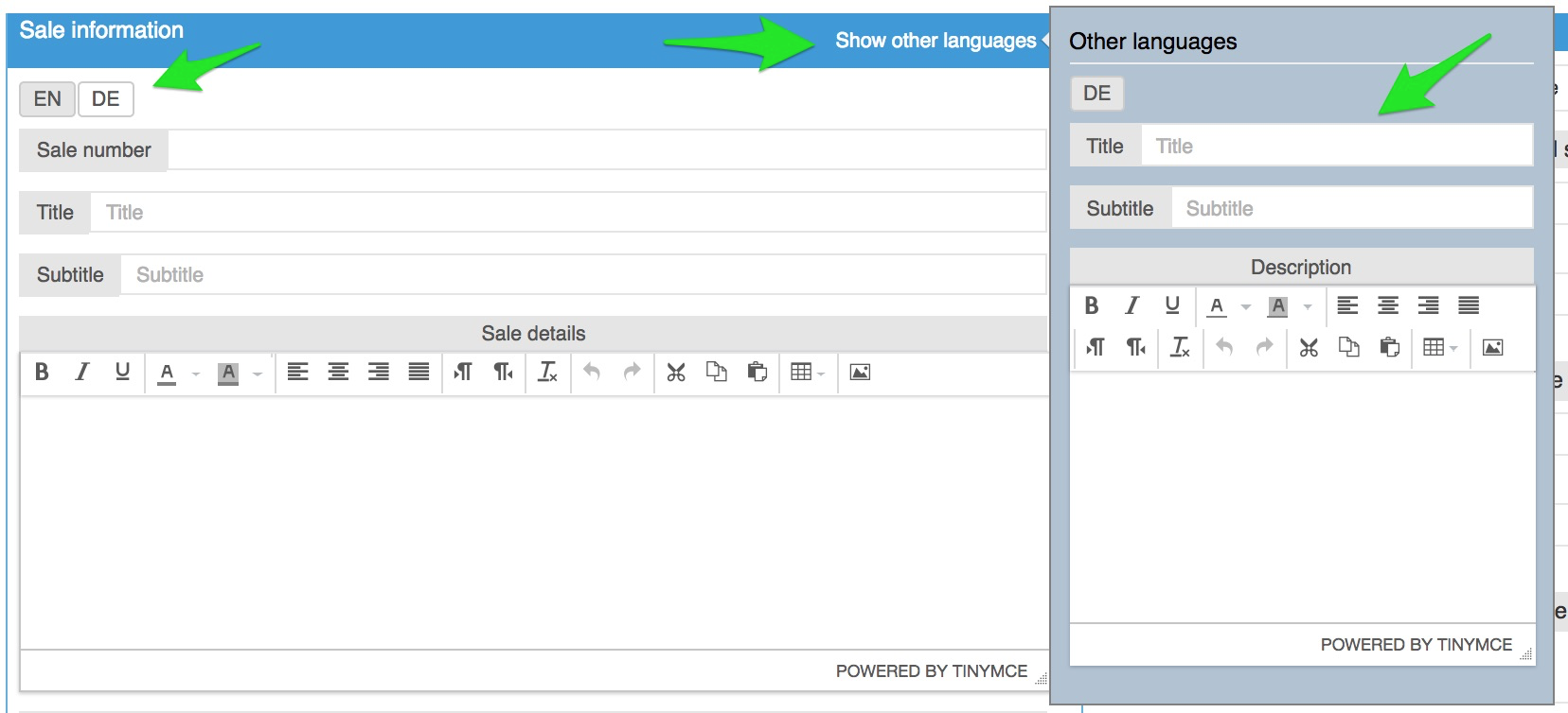 Sale Information - you can enter the sale description in several languages. This content will be displayed on the site. Click on one of the language buttons (i.e EN, DE, HE etc.) to fill in the Sale Information fields in the chosen language. For example: click on EN button and fill in the Title, Subtitle and Sale Details in English. Then click on DE button and fill in the same fields in German.